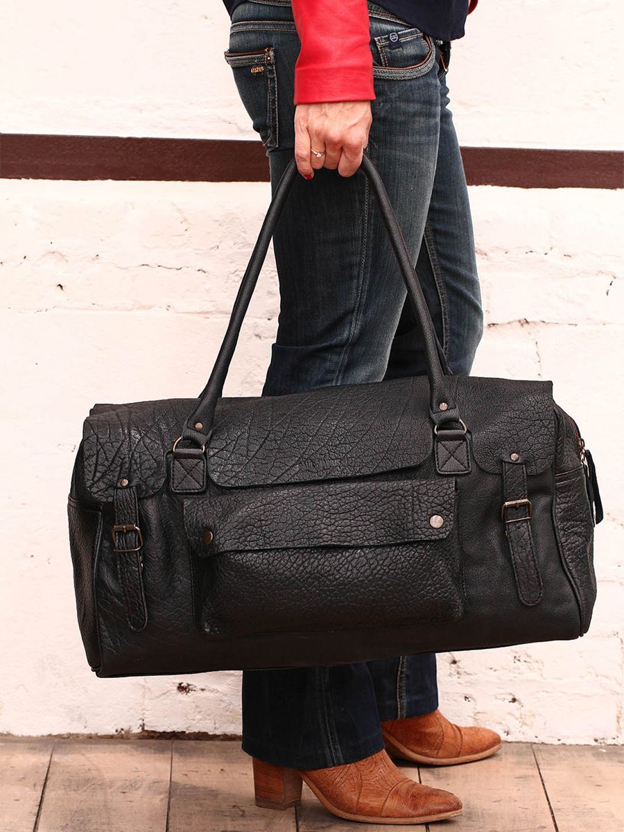 Een elegante zwarte leren reistas voor mannen en vrouwen.